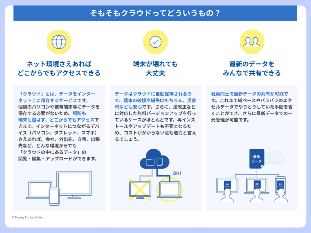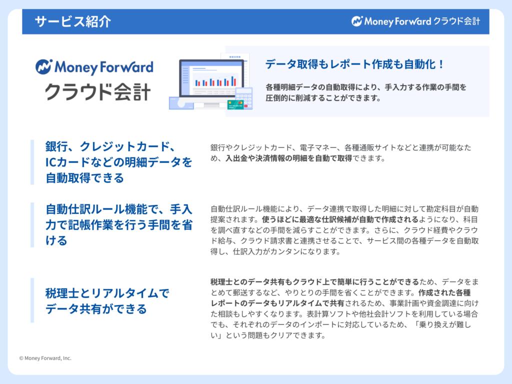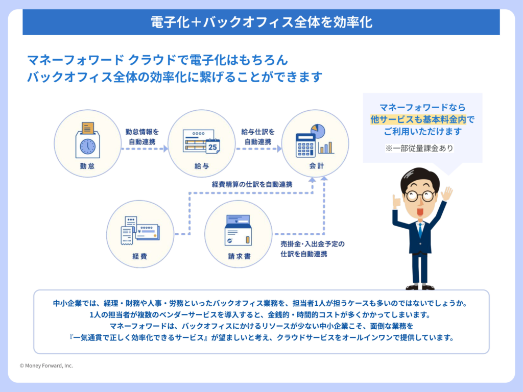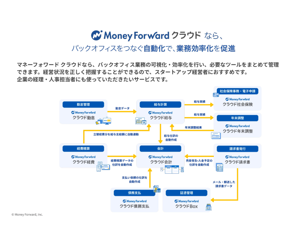 マネーフォワードクラウド会計を中心に給与・勤怠・経費精算等を低コストで利用でき、大企業の経理事務にも対応している当システムは、人的リソースの少ない個人事業や零細法人等にこそ使用していただければ、その利便性を実感できるシステムであると確信しております。